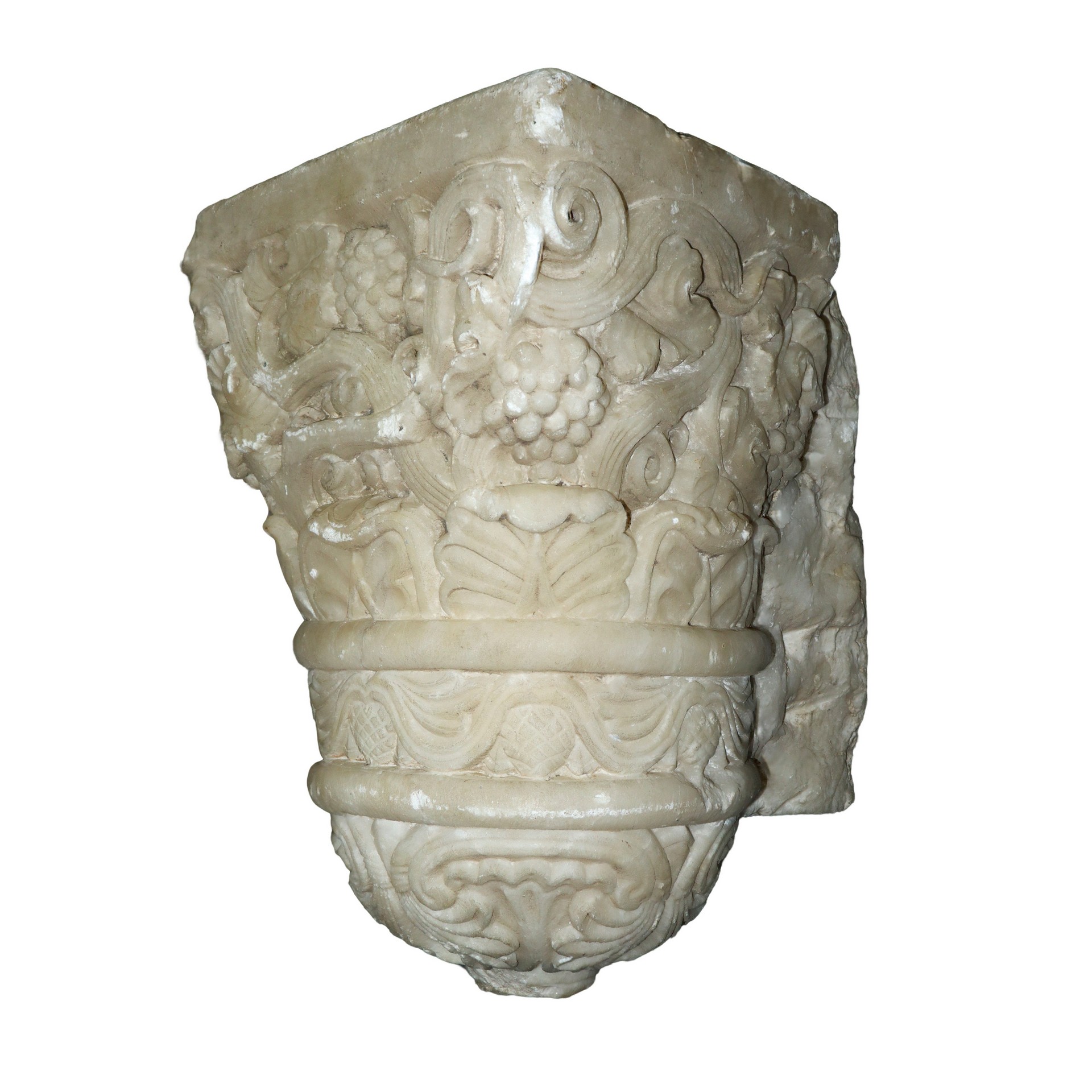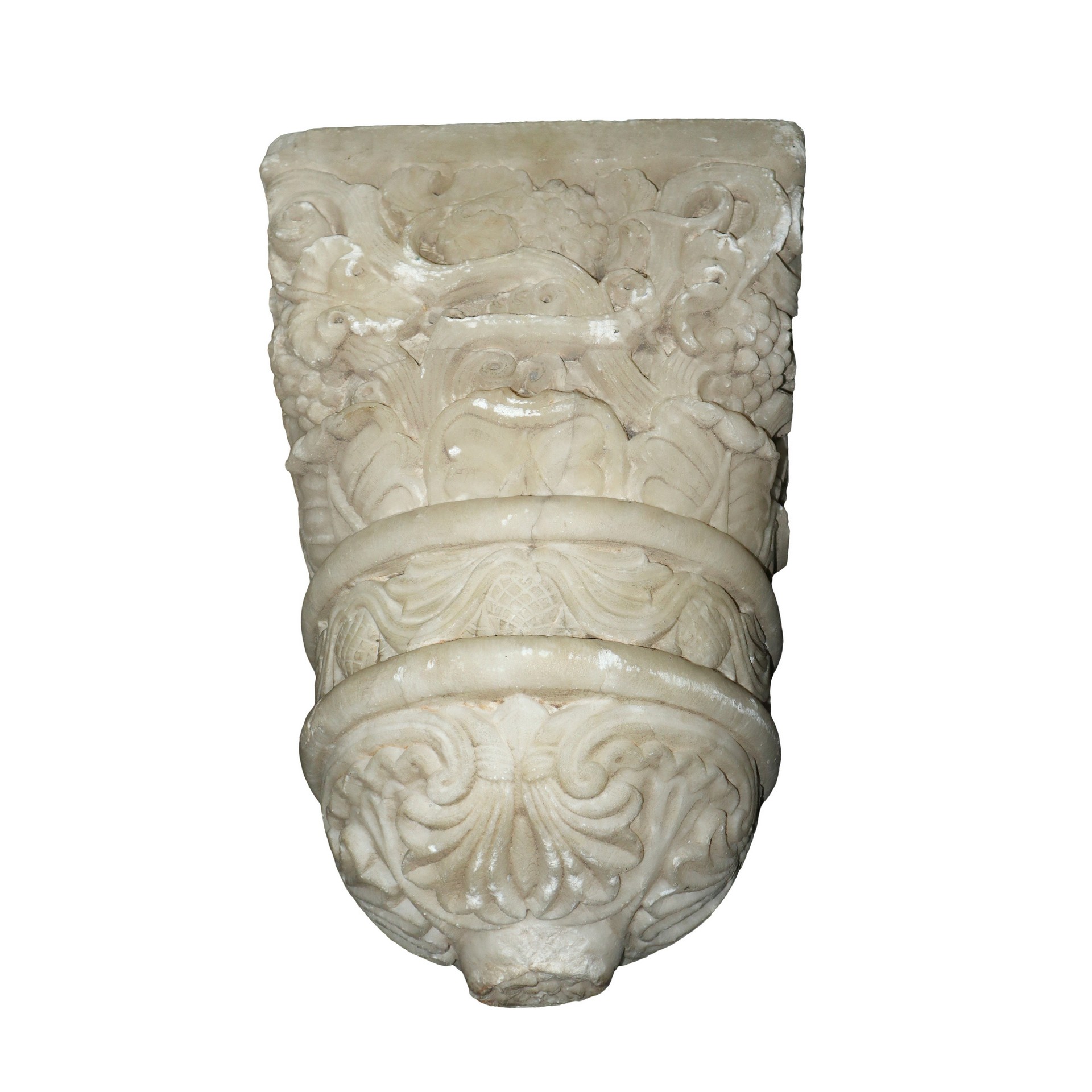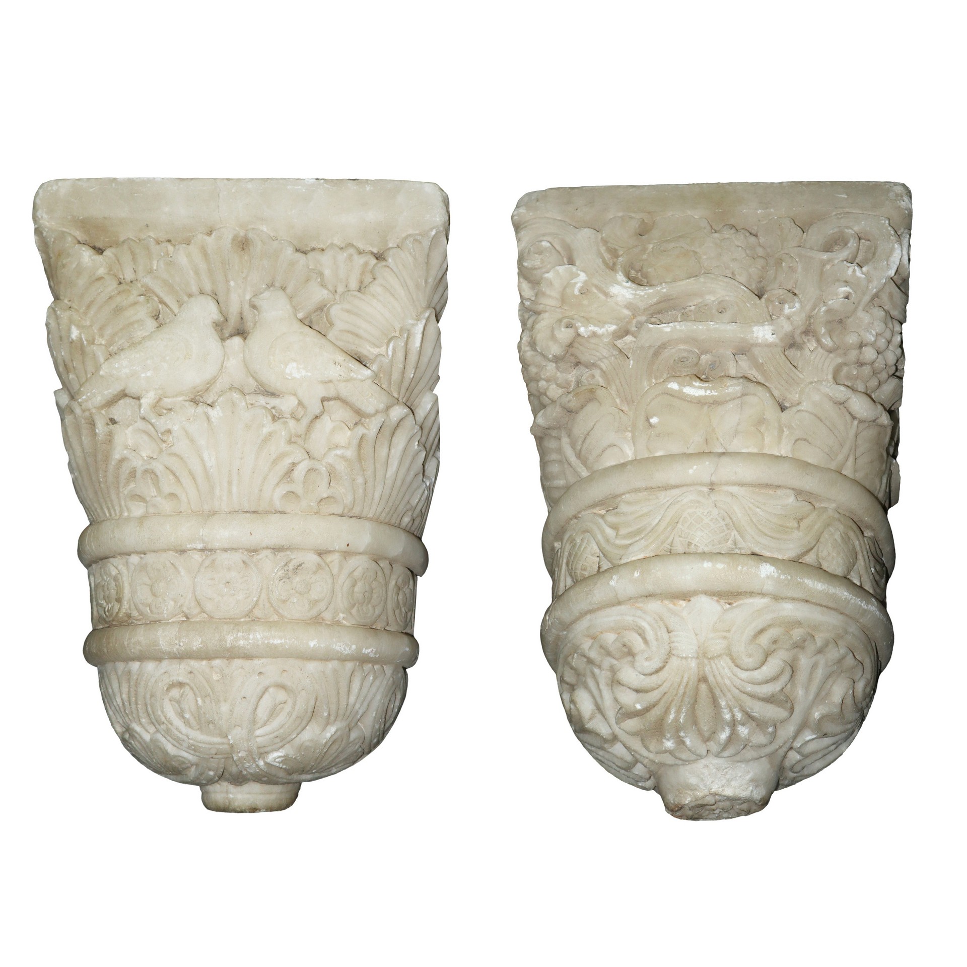 Coppia di mensole da incasso in marmo bianco scolpiti con foglie d'acanto e stilemi floreali, 14th/15° secolo
