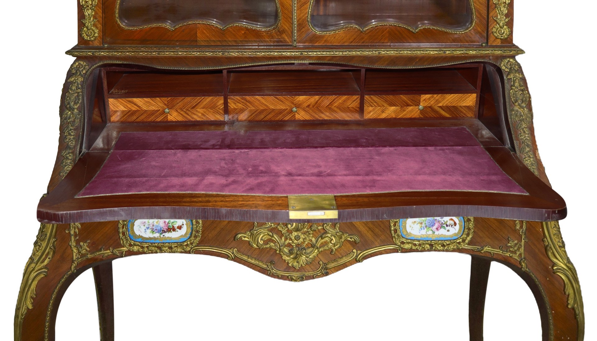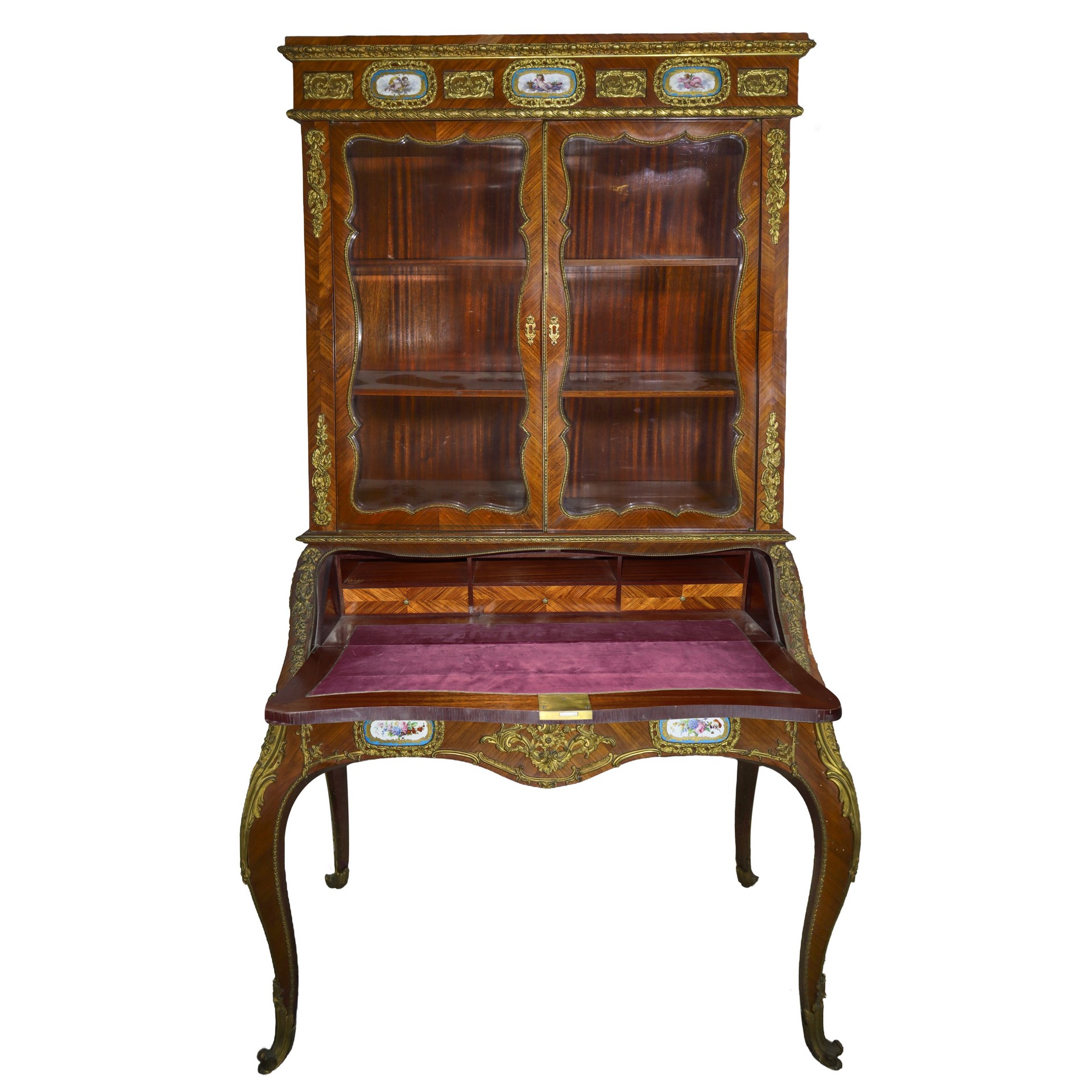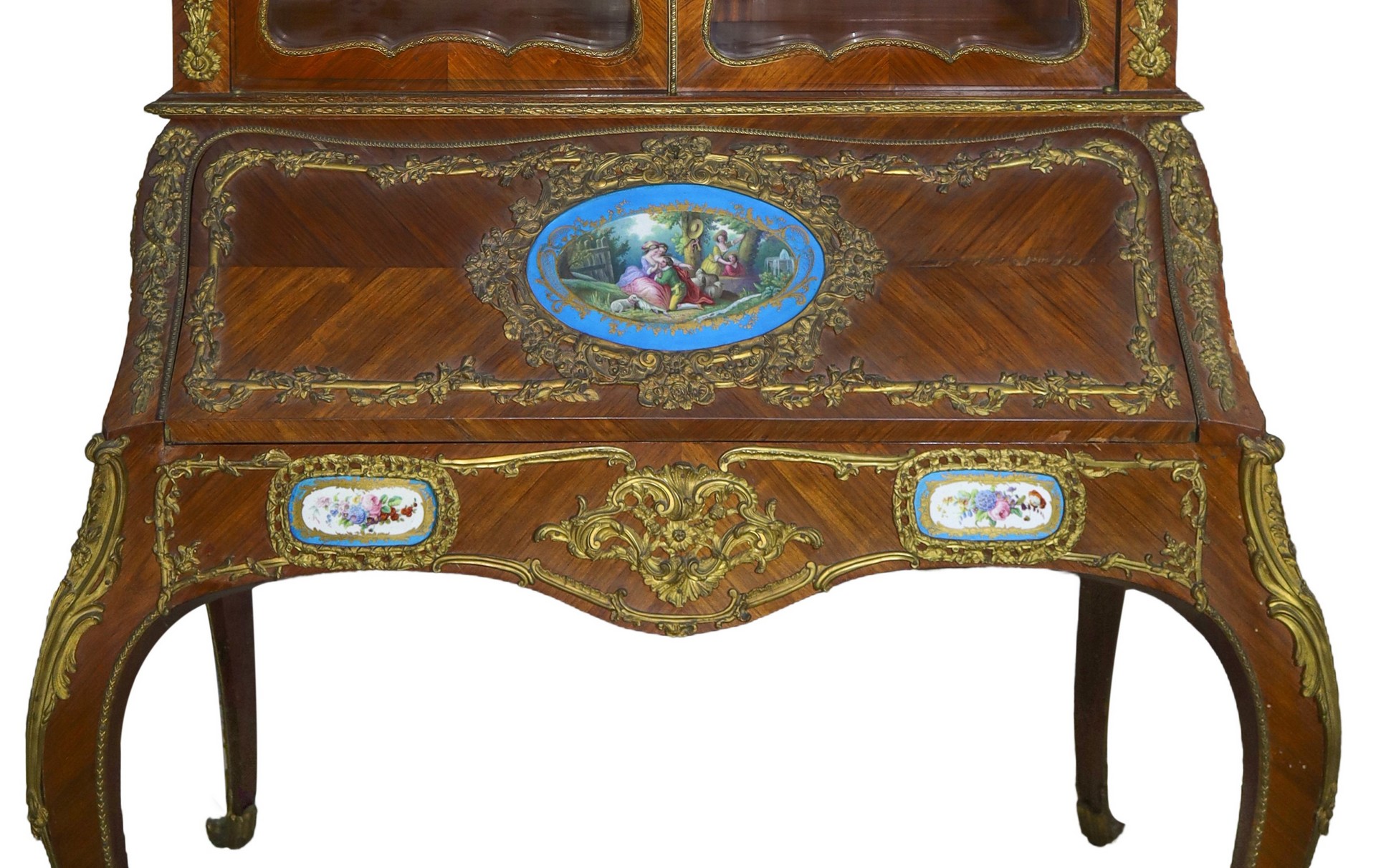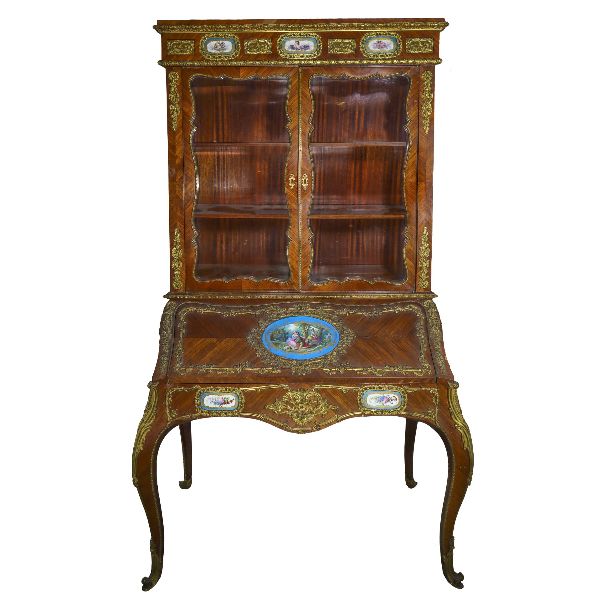 Mobile a vetrina con ribalta, porcellane stile Sevres applicate e bronzi Napoleone III, nineteen° secolo