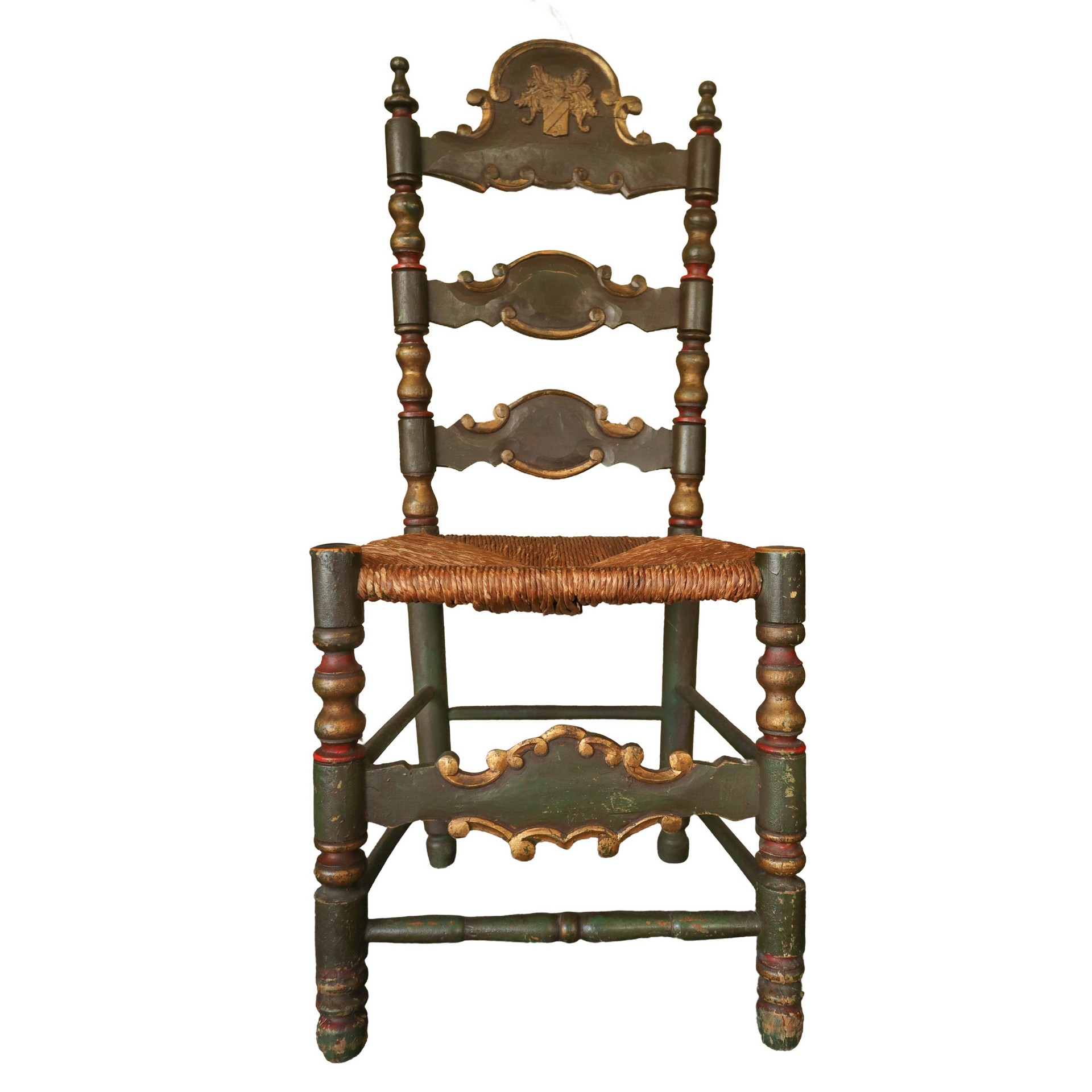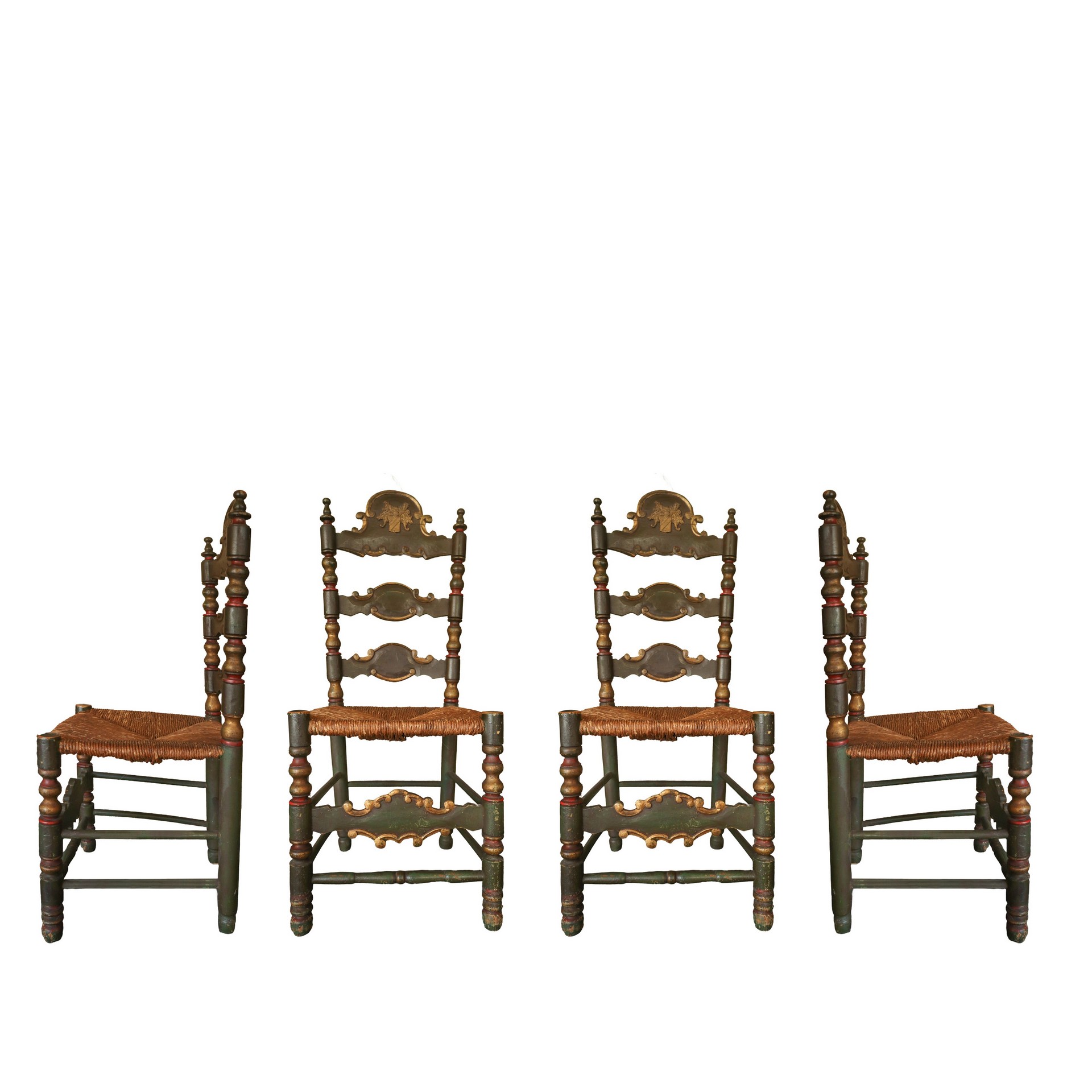 N. 4 seggioloni in legno laccato verde e oro con stemma, primi 20° secolo H cm 112x46 x43 Sedita impagliataSedita impagliata