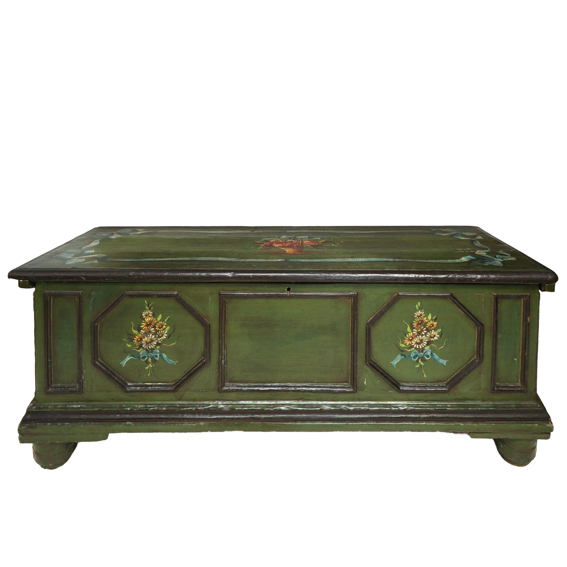 Cassapanca laccata e dipinta nei toni del verde, nineteen° secolo H cm 57x142x55 Con decorazioni di mazzi di margherite sul fronte entro riserve ottagonali, piedi a pigna, chiusura a gangheriCon decorazioni di mazzi di margherite sul fronte entro riserve ottagonali, piedi a pigna, chiusura a gangheri