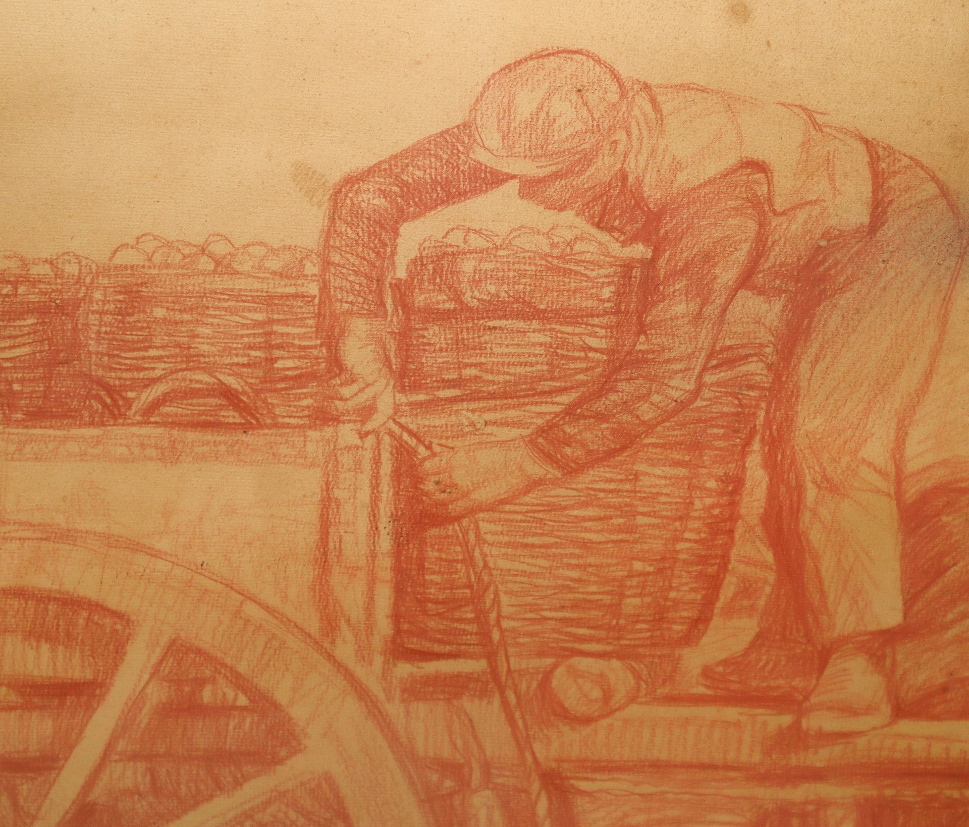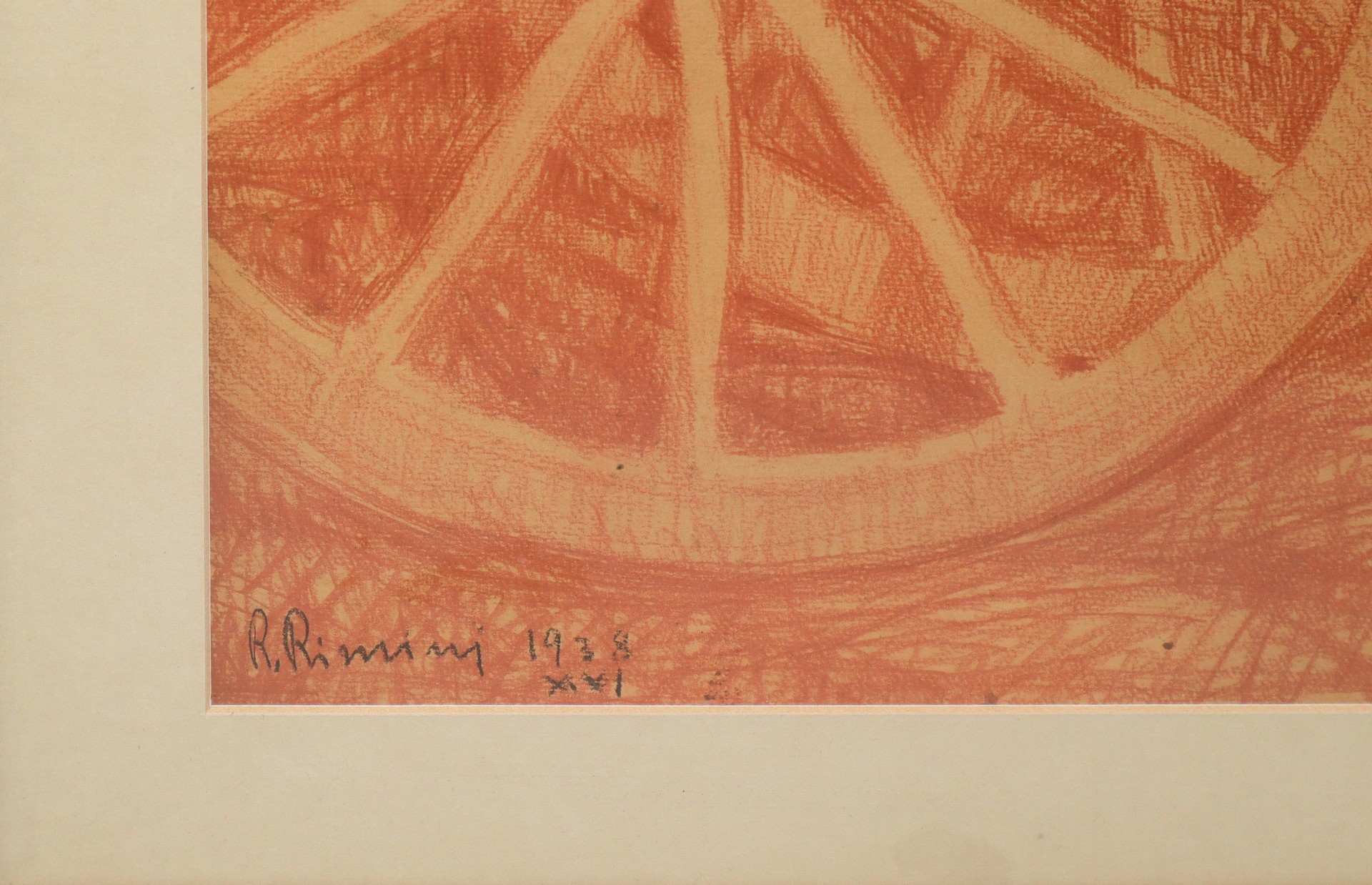 Roberto Rimini (Palermo 1888-1971) - Uomo su carretto, 1938 cm 61 x 47, in cornice 76 x 61 Sanguigna su cartoncino Firmato in basso a sinistra e datato. Pubblicato sul volume "Roberto Rimini", Giuseppe aimone Editore (2002), pag. 243.