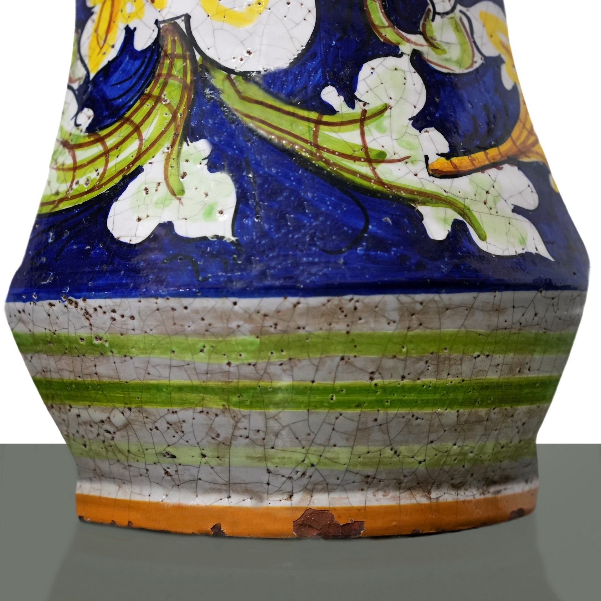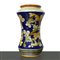 Vaso a cilindro in maiolica di Caltagirone, sfondo blu con decori floreali bianchi, gialli e verdi, primi 20° secolo