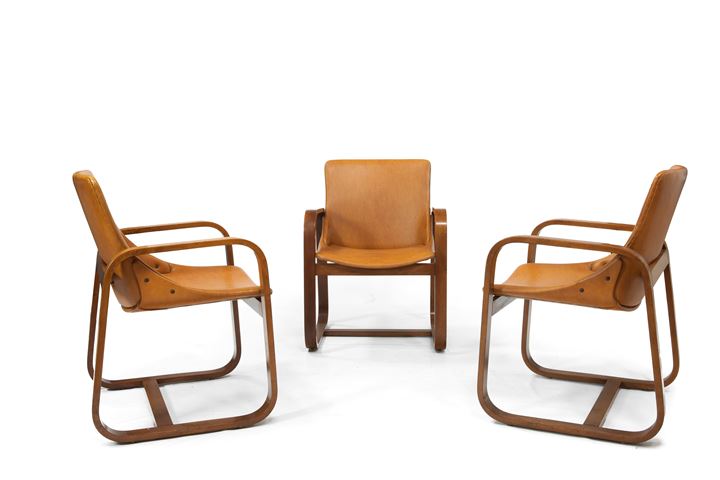 PAGANO POGATSCHNIG GIUSEPPE Tre sedie in legno lamellare curvato con seduta...