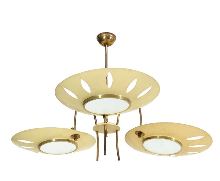 Lampada a sospensione con struttura in ottone e diffusori in alluminio laccato e vetro satinato.