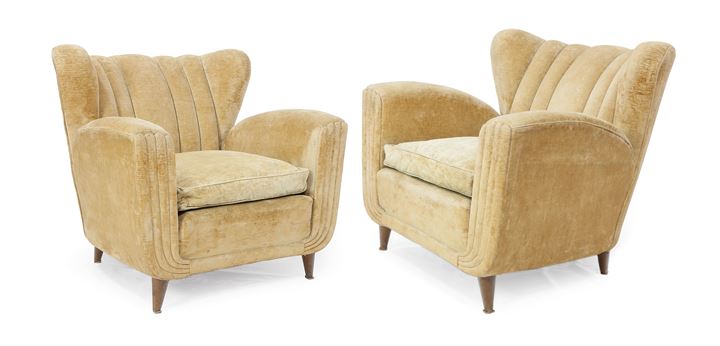 PRODUZIONE ITALIANA Coppia di poltrone con struttura in legno di noce e...