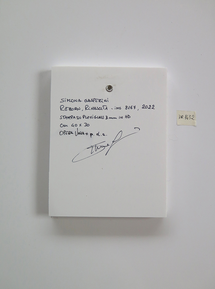 SIMONA GASPERINI, "Reborn" (Rinascita), 2023, stampa su plexiglass 3mm in HD, dim 40x30 cm, opera unica. Al verso: nome autrice, titolo, n°immagine 8167, anno, tecnica, dimensione, opera unica, firma. Autentica su foto dell'artista.