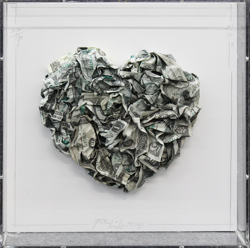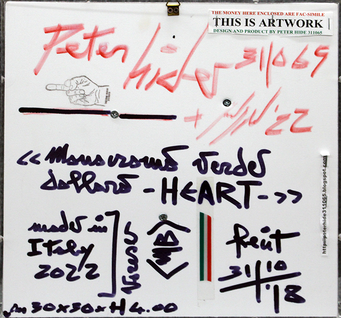 PETER HIDE, HEART (monocromo verde dollaro), 2022, scultura tecnica mista e banconote su tela su forex bianco, dim 30x30x5. Opera con autentica su foto dell'artista e numero d'archiviazione: CF1064-22. Opera protetta da teca in plexiglass.