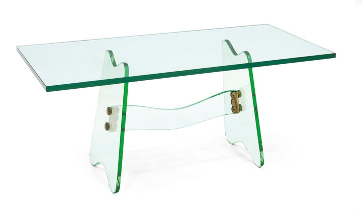 Tavolino con piano e supporti in vetro verde Nilo e finiture in ottone.