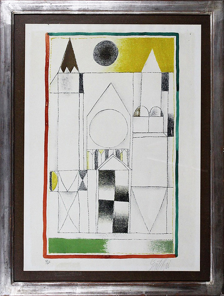 FRANCO GENTILINI, Cattedrale, anni '70, Litografia, Dim. 66x47, Al fronte: esemplare n°83/125 in basso a sinistra, firmato in basso a destra. Opera con cornice
