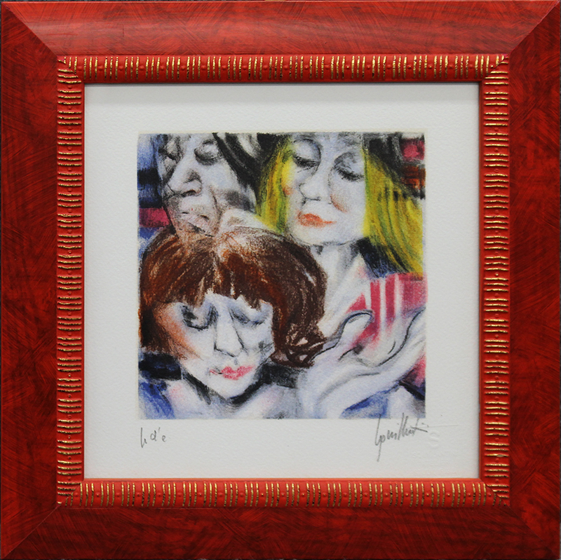 REMO SQUILLANTINI, "Gruppo di donne", anni '80, litografia su cartoncino, esemplare PA, dim 20x20. Al fronte: tiratura in basso a sinistra, firma e timbro "Squillantini Aterlier" in basso a destra. Opera con cornice.