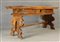 Firmato. Tavolo in legno di noce intagliato con cassetto, sul piano due busti...