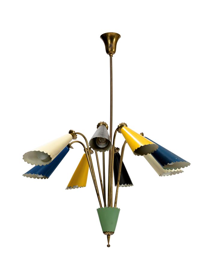 Lampada a sospensione con struttura in ottone e lamiera laccata.