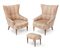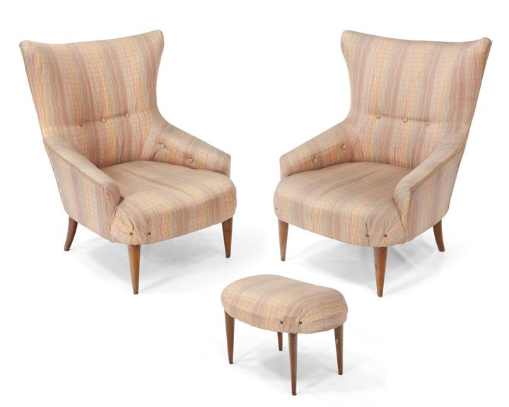 Coppia di poltrone ed un poggiapiedi con struttura in legno e imbottitura rivestita in tessuto
