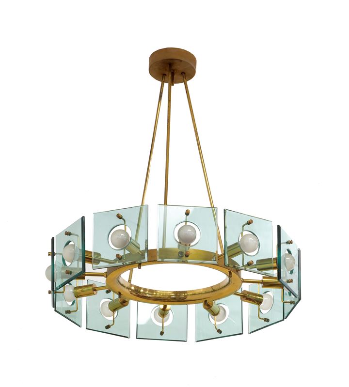 PRODUZIONE ITALIANA Lampada a sospensione con struttura in ottone lucidato e...
