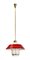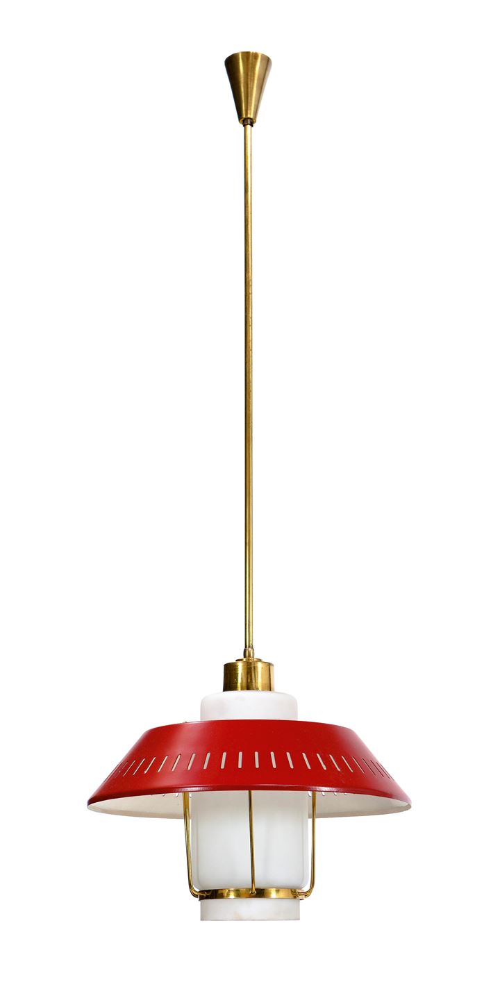 Lampada a sospensione in ottone e metallo laccato. Diffusore in vetro satinato.