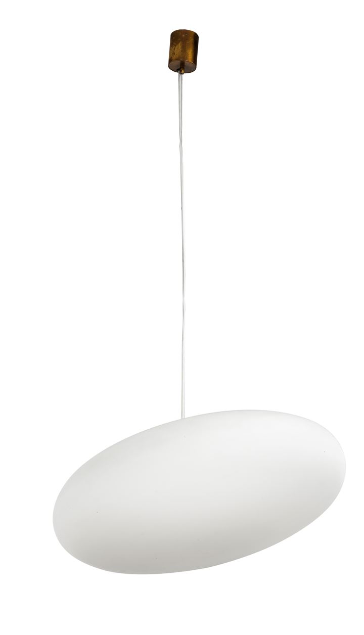 Lampada a sospensione in vetro triplex opal e ottone lucido.