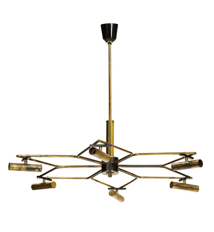 Lampada a sospensione in ottone e metallo verniciato. Diffusori in ottone.