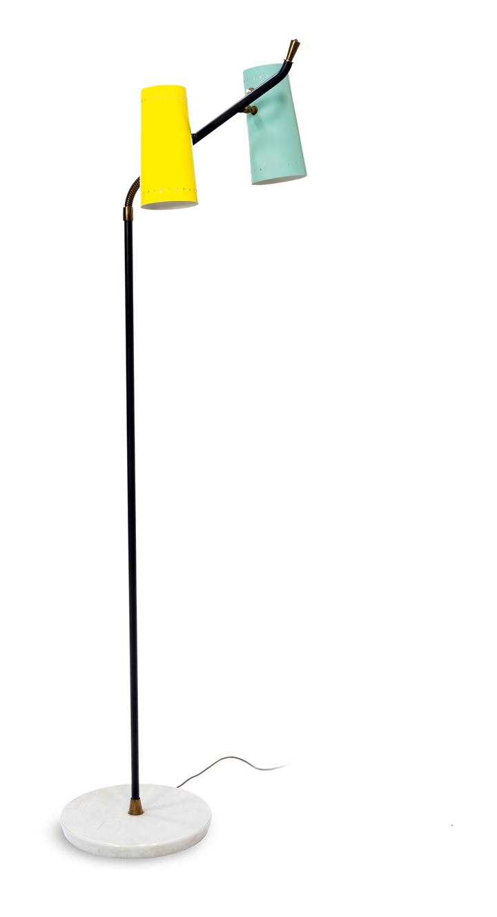 Lampada da terra in metallo laccato e ottone, base in marmo e diffusori in alluminio verniciato.