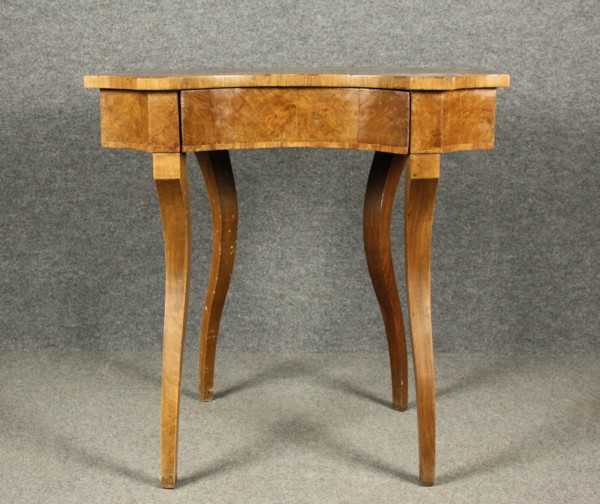 Piccolo scrittoio a fagiolo in legno lastronato in noce con cassetto centrale e gambe a sciabola. Inizi XX secolo. Mis. Lung. cm. 74 Alt. cm. 73 Prof. cm. 52 ca.