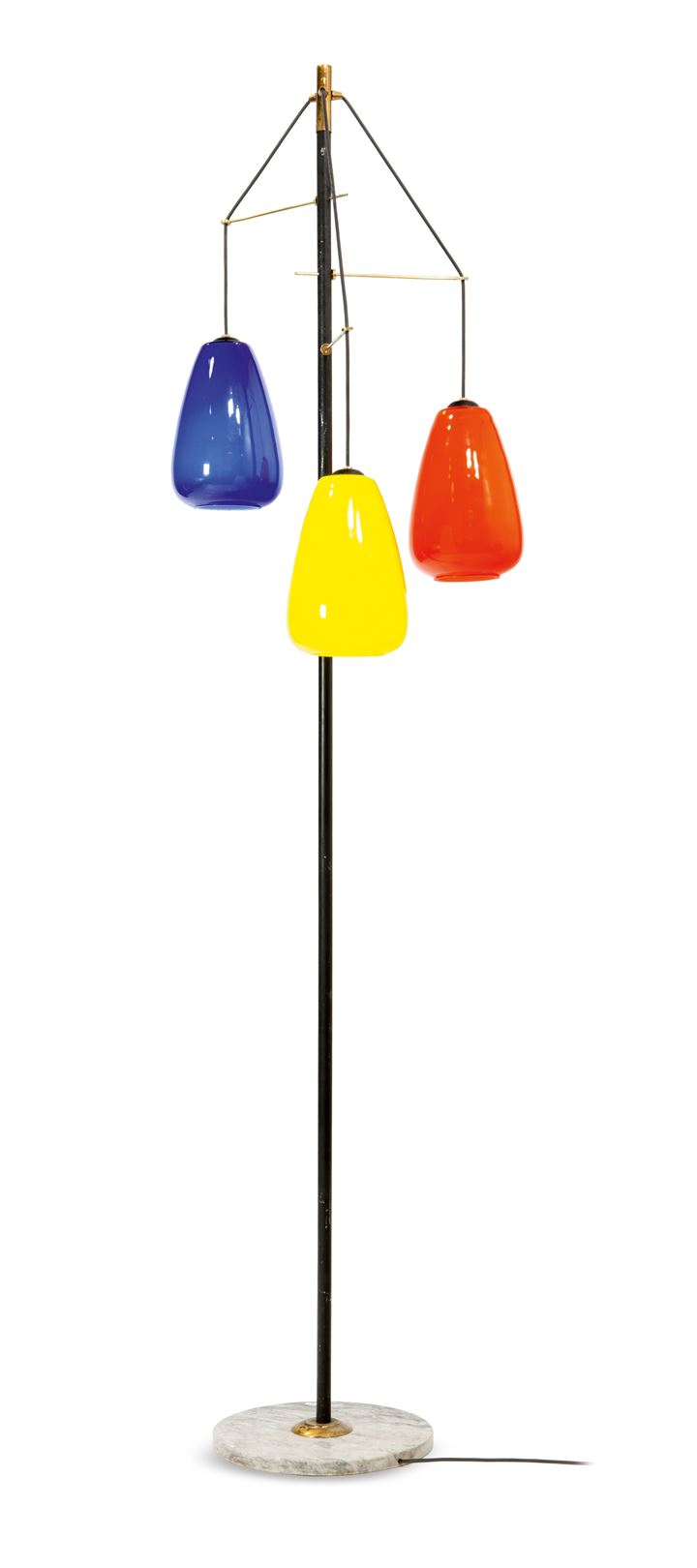 Lampada da terra con struttura in metallo laccato, base in marmo e diffusori in vetro incamiciato colorato.