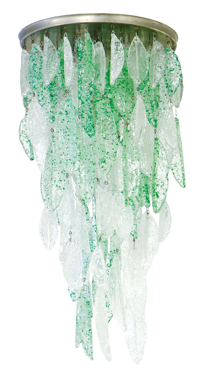 Lampada a sospensione a ottantaquattro ordini di elementi in vetro ghiacciato nei colori bianco e verde.