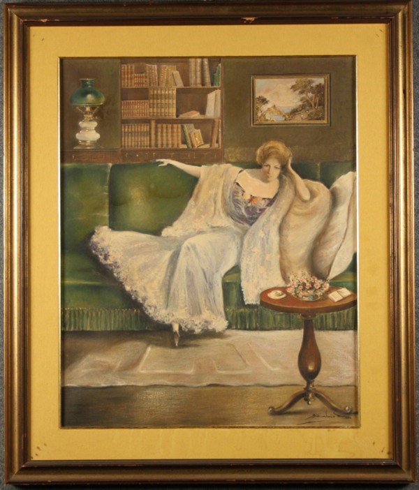 Tempera su cartone raff. ''DONNA IN POSA SUL DIVANO''. Firma non identificata in basso a destra. Anni '40-'50. In cornice. Mis. Lung. cm. 60 Alt. cm. 74 ca.