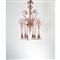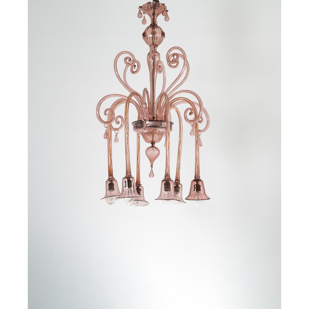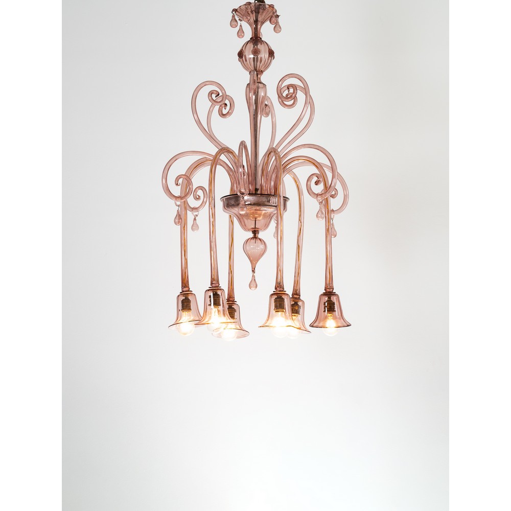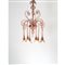 Lampada a sospensione a sei luci in vetro soffiato rosato, braccia pendenti verso il basso, coppe a campana, volute, struttura in metallo.