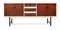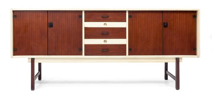 Credenza in legno di teak, struttura laccata bianca e ante in legno.
