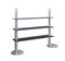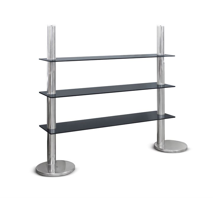 Libreria con struttura in metallo cromato e piani in vetro.