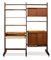 Libreria a due campate con piccola scrivania, contenitori ed elementi estraibili. Struttura in legno di teak e ottone.