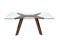 Tavolo con struttura in legno caratterizzata dalla doppia gamba, piano in vetro.