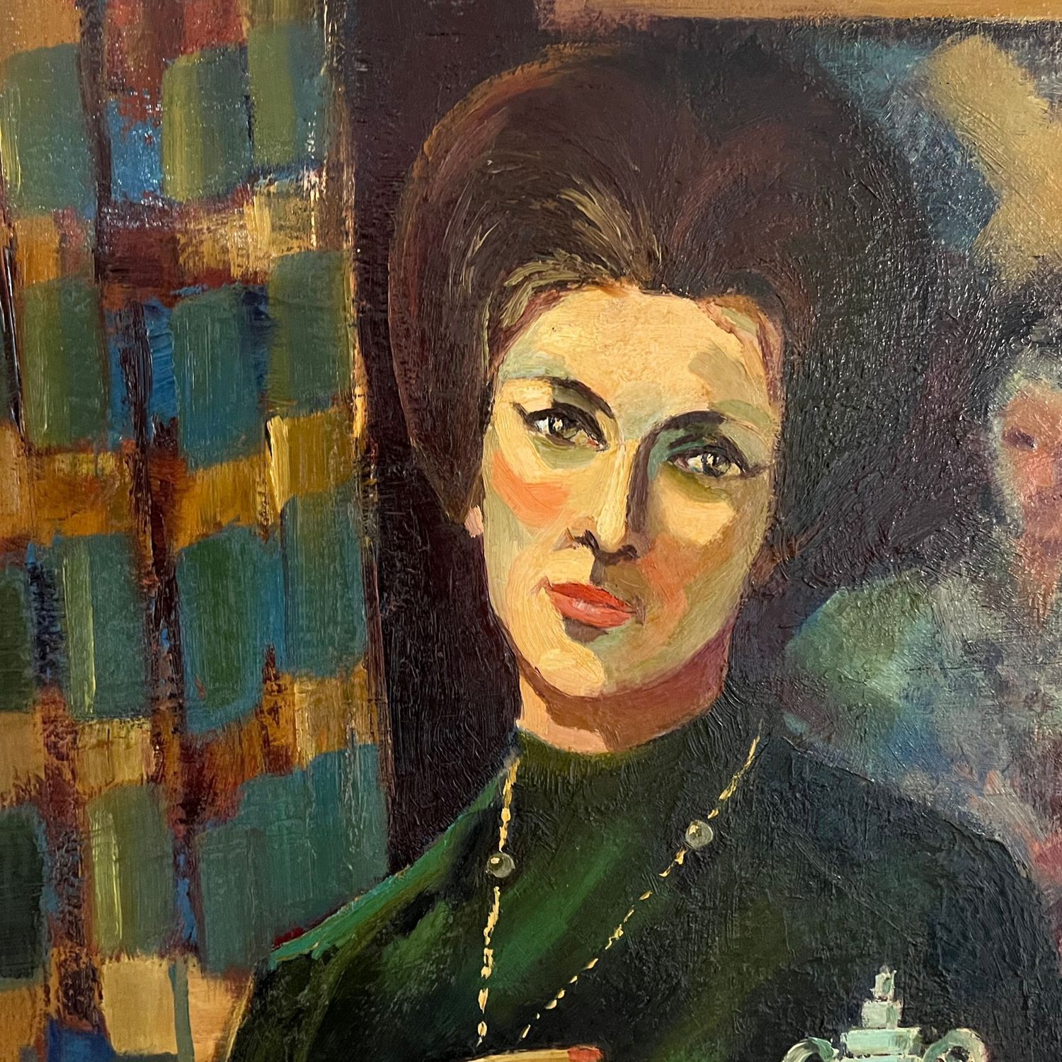 Dipinto olio su tela attaccato su pannelo, periodo 1962 raffigurante Ritratto di donna con abito verde.