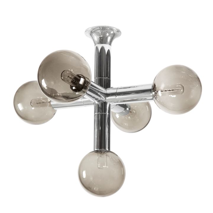 Lampadario modulare con struttura in acciaio cromato e diffusori in vetro.