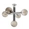 Lampadario modulare con struttura in acciaio cromato e diffusori in vetro.