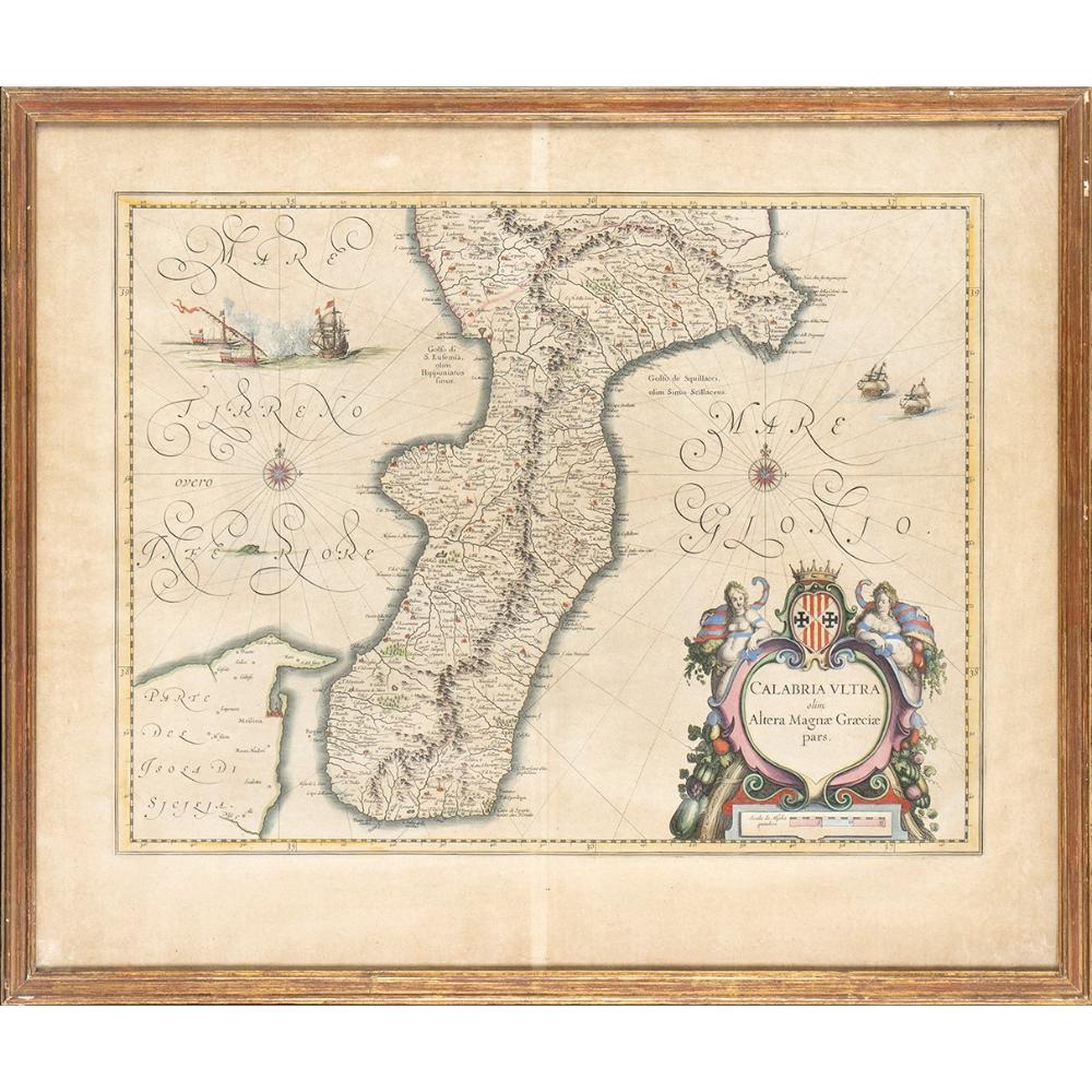 55x62 cm Antica carta topografica acquarellata raffigurante la Calabria Citra olim Magna Gregia. Dimensioni compresa la cornice