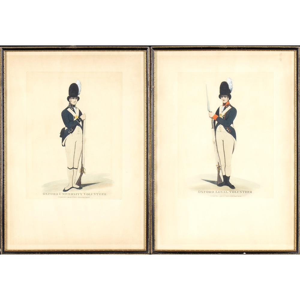 Lotto di due stampe, la prima raffigurante un fante dell' "Oxford University Volunteer", la seconda un "Oxford Loyal Volunteer" con moschetto e baionetta innestata.