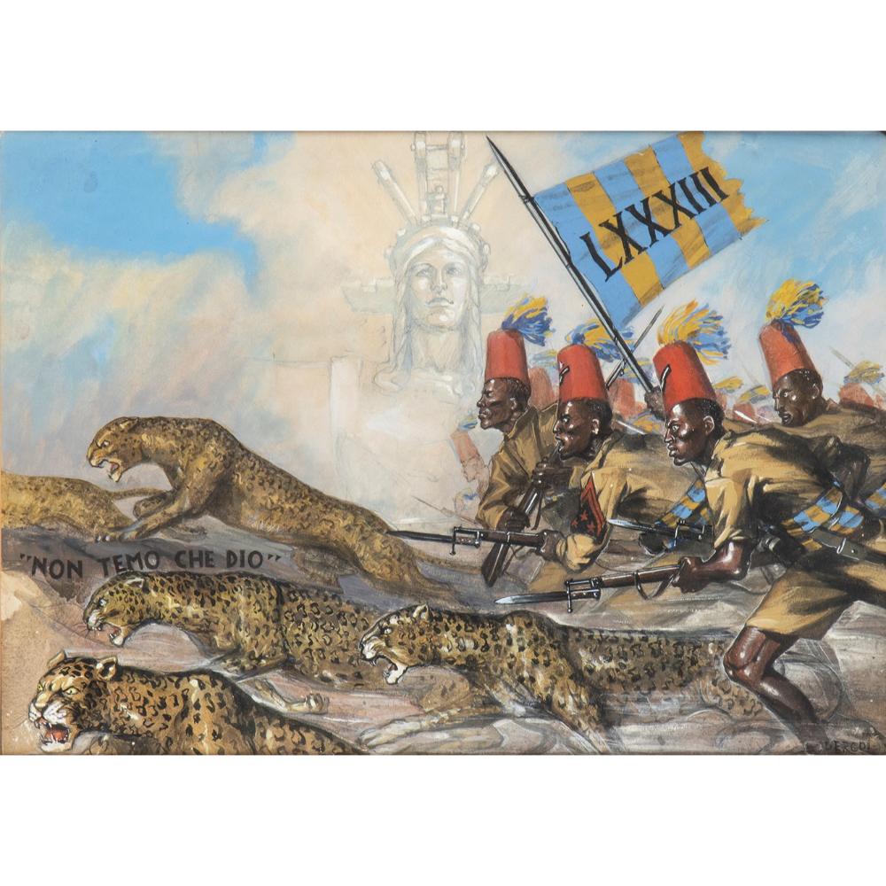 83° battaglione coloniale. Ascari all'attacco con leopardi e, sullo sfondo, l'allegoria dell'Italia.
