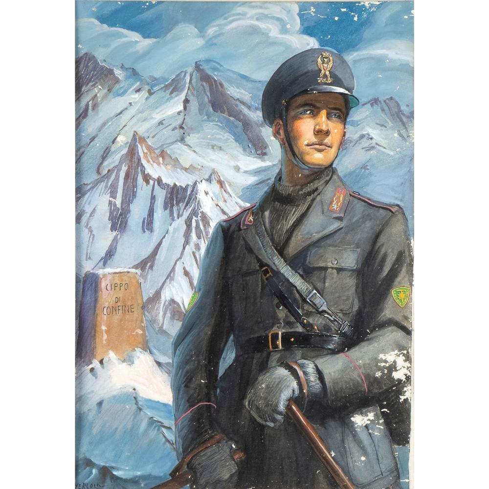gouache su cartoncino rappresentante agente della PS di frontiera, in cornice 62 x 49 cm