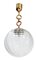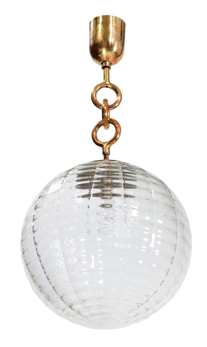 Lampada a sospensione con montatura in ottone lucido e diffusore in vetro cordonato trasparente.