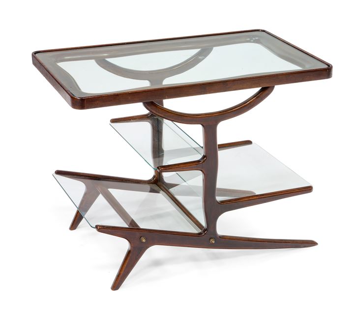 LACCA CESARE Tavolino in legno di ciliegio e ripiani in vetro. Anni '50 cm...
