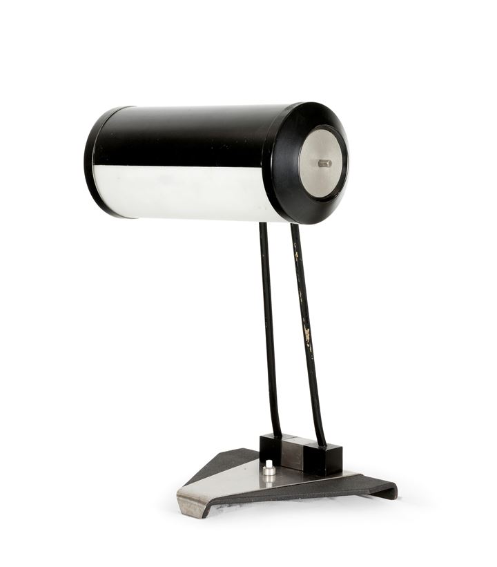 Lampada da tavolo in acciaio verniciato, ottone nichelato e vetro satinato.