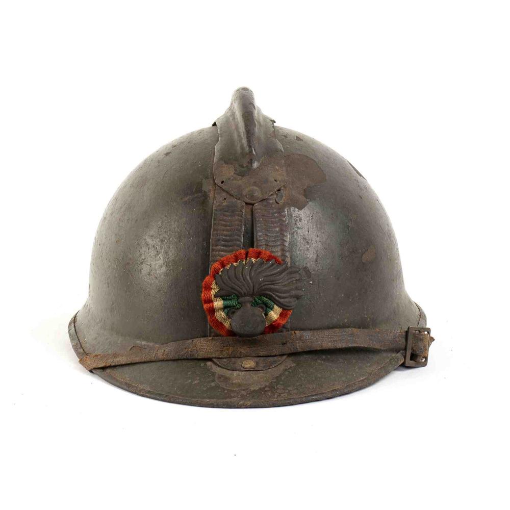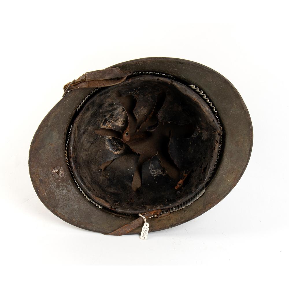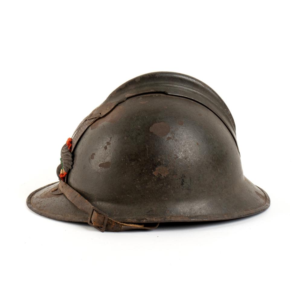 Eccezionale e rarissimo elmetto di fabbricazione italiana con cappio applicato per rivettatura, coccarda da truppa e fregio per Carabinieri in ferro, interno di pelle nera, segni di usura, bella patina, raro