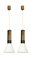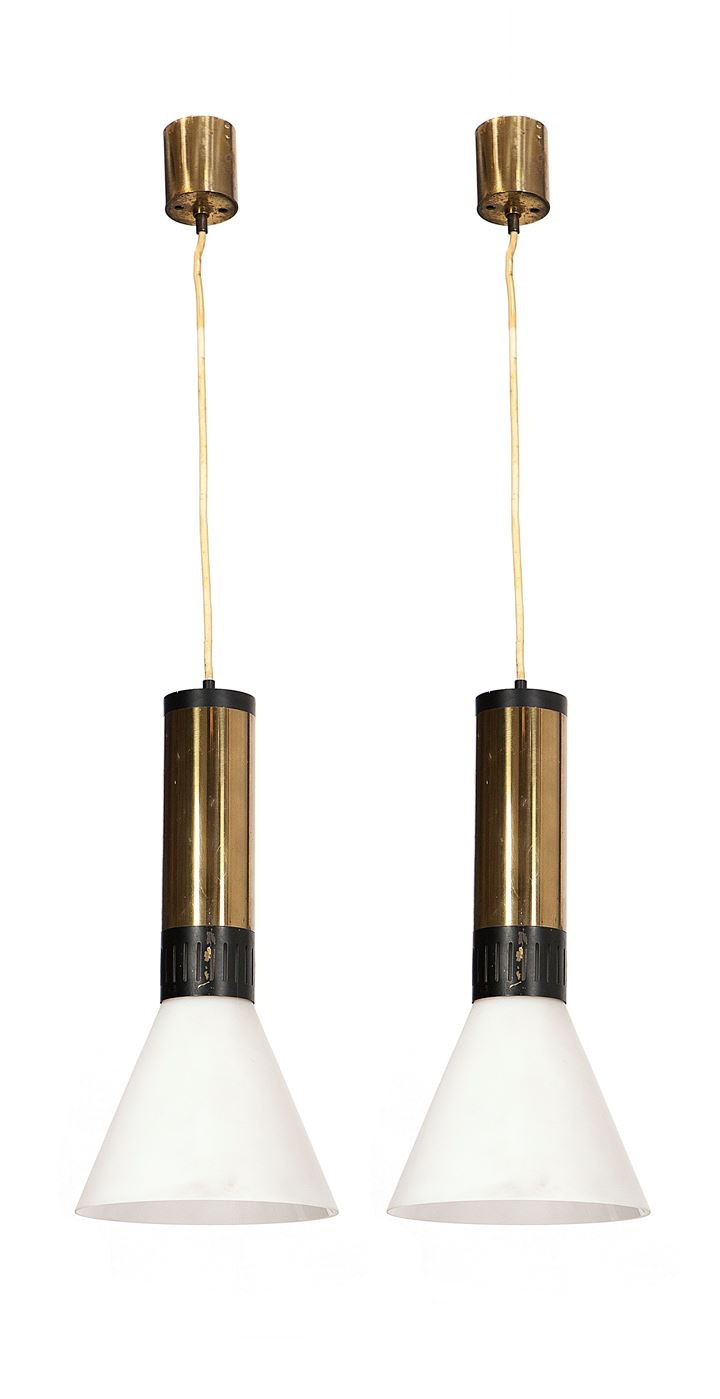 Coppia di lampade a sospensione in ottone zapponato, metallo smaltato e diffusori in vetro opalino.