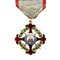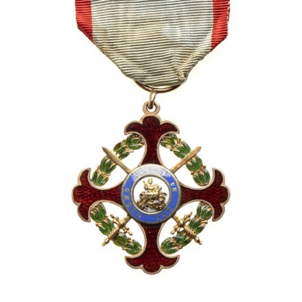 ORO, SMALTI, 34 MM BELLISSIMA Croce con spade e ghirlanda, in oro e smalti rossi, bianchi, verdi e azzurri; al centro SAN GIORGIO su cerchio di smalto BIANCO E CARTIGLIO CELESTE, IN HOC SIGNO VINCES. NASTRO ORIGINALE