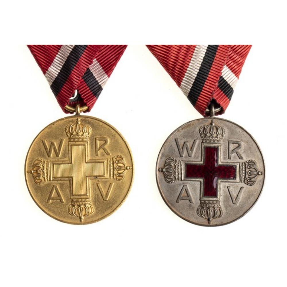 BRONZO DORATO, ARGENTO, SMALTI ROSSI LOTTO DI DUE CROCI AL MERITO DELLA CROCE ROSSA PRUSSIANA, UNA CLASSE ORO NON SMALTATA ED UNA ARGENTO CON SMALTI, NASTRI ORIGINALI