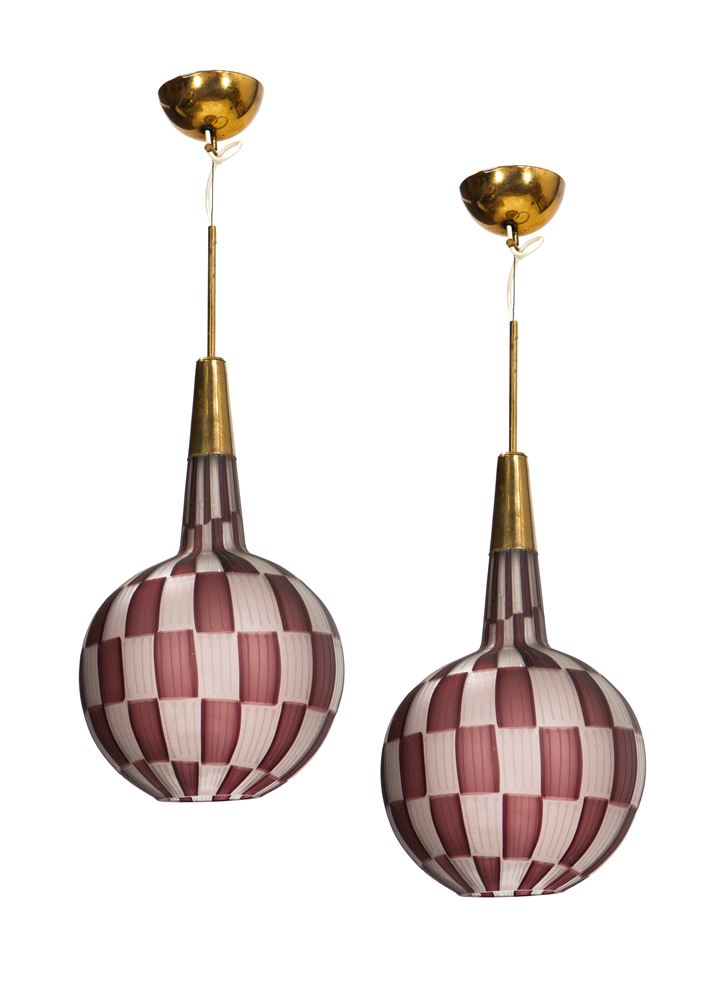 MOROSATI TEA Due lampade a sospensione in ottone, vetro soffiato di Barovier...