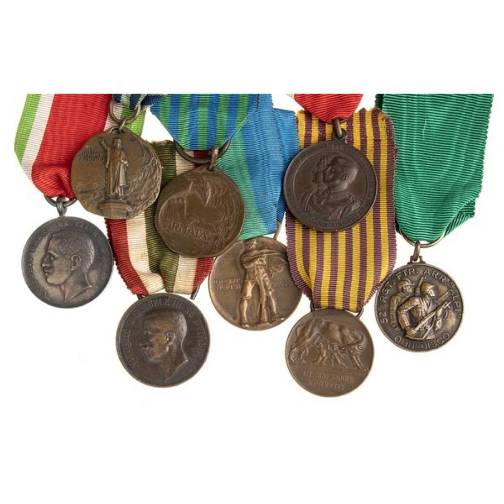 BRONZO, ARGENTO, MISURE DIVERSE LOTTO COMPOSTO DA OTTO MEDAGLIE, UNA DEL RADUNO DI TRENTO PER IL CINQUANTENARIO DEL CORPO, UNA MEDAGLIA DEL COMUNE DI ROMA PER I REDUCI DELLA GRANDE GUERRA, DUE MEDAGLIE DELLA SETTIMA ARMATA, UN’UNITA’D’ITALIA, UNA IN ARGENTO REGIA ZECCA DELLE SCUOLE ITALIANE AITMANUELEALIAN ALL’ESTERO, UNA IN BRONZO COMMEMORATIVA LE NOZZE DI RE VITTORIO EMANUELE III, ED UNA REPUBBLICA
