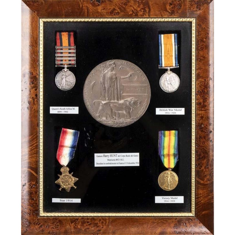 MATERIALI E MISURE DIVERSE INTERESSANTE MEDAGLIERE IN CORNICE DEL SOLDATO DEL GENIO HERRY HUNT. IL MEDAGLIERE E’ COMPOSTO DA UNA GRANDE MEDAGLIONE IN MEMORIA DEL CADUTO, LE TRE MEDAGLIE DELLA GRANDE GUERRA ED UNA SOUTH AFRICA MEDAL CON 5 BARRETTE, SOUTH AFRICA 1902, SOUTH AFRICA 1901, TRANSVAAL, ORANGE FREE STATE, CAPE COLONY