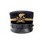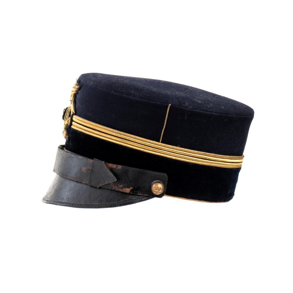 fusto rigido ricoperto di panno di lana nero filettato giallo arancio, fregio di canottiglia dorata, fodera di seta con marchi del fabbricante, in ottimo stato