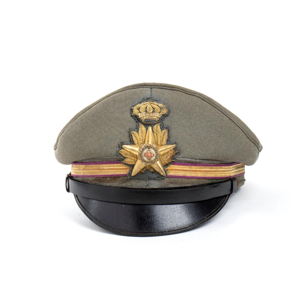 berretto alla bulgara con piccola visiera spiovente tipica del periodo bellico, bel fregio ricamato di canottiglia dorata, grado profilato di viola, colore distintivo del servizio, interno anonimo, in ottimo stato, molto raro